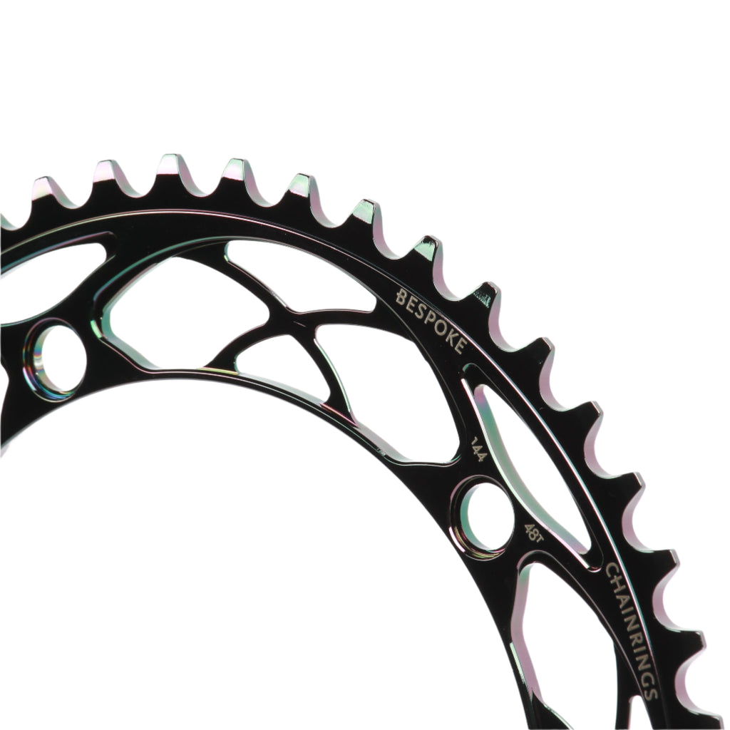 Engineered to optimize performance, the tooth profile on Bespoke chainrings is smooth and curved on all sides, with wide arcs that fit the chain exactly, ensuring perfectly tuned acceleration and deceleration.