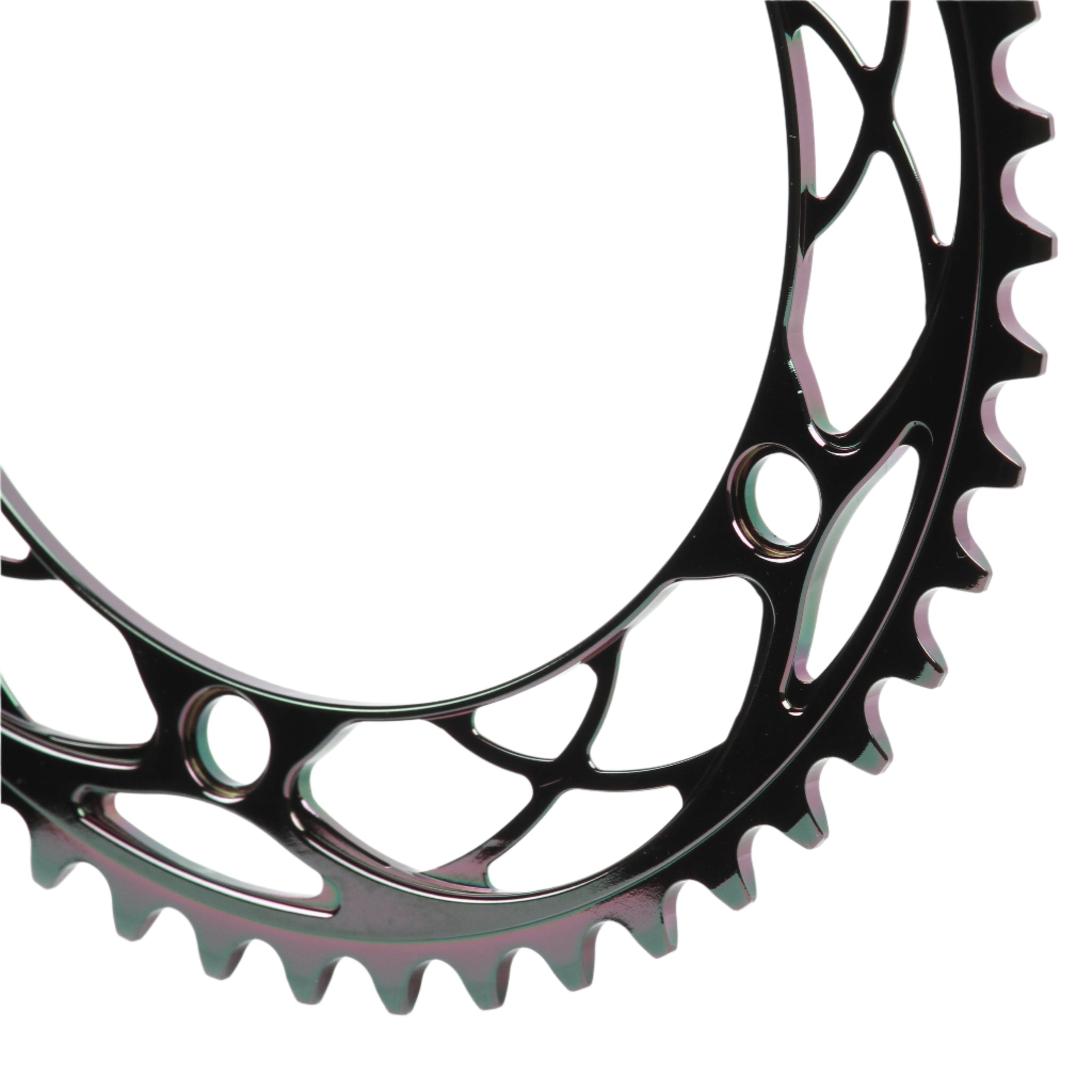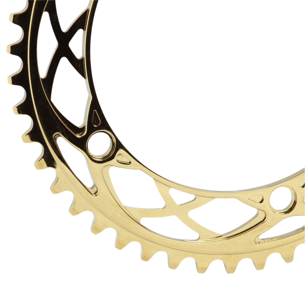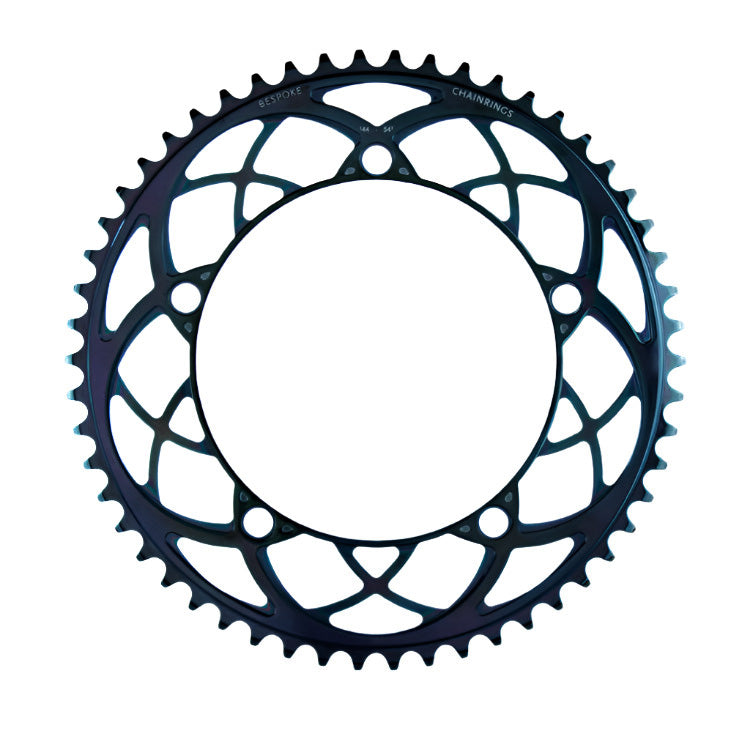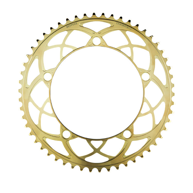 Inspired by segmented stained glass rose windows found in Gothic cathedrals, Bespoke's Rose Window chainrings are precision double-machined to be lightweight, stiff and beautiful, and feature an extremely hard, extremely smooth titanium PVD coating to reduce friction and enhance its appearance.