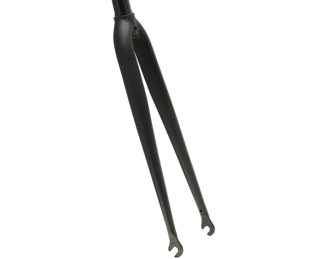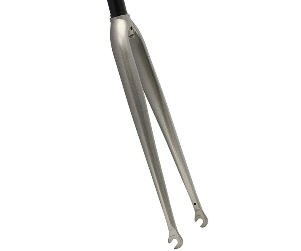 A rugged 1 1/8" threadless straight blade fork with added clearance for big tires. 32mm knobbies fit so you could probably stuff some 35mm road tires in there without much fuss.