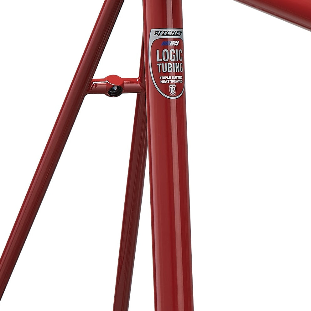 The frame is constructed from TIG-welded, triple-butted, and heat-treated Ritchey Logic tubing and features a unique flared 1 1/8" head tube, custom Ritchey Logic dropouts, and internal ED coating throughout to prevent corrosion. A Ritchey Comp Carbon Road Fork is included, resulting in a versatile frameset that is both supple and responsive, with clearance for 28mm tires in both the front and rear.