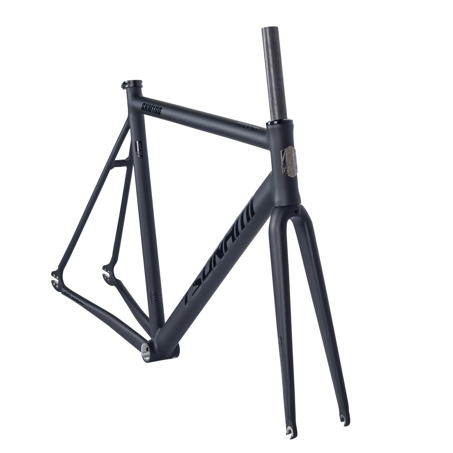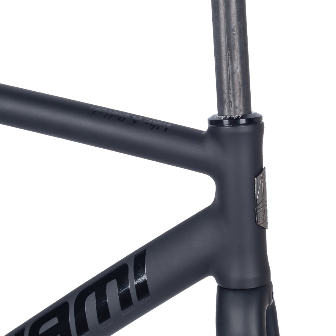Made of double butted 6061 aluminum alloy tubes with smooth welds, this frameset features a 35mm offset full carbon fork, sealed cartridge integrated headset, double-sided stainless steel dropout plates, excellent paint quality and clearance for most 30mm tires.
